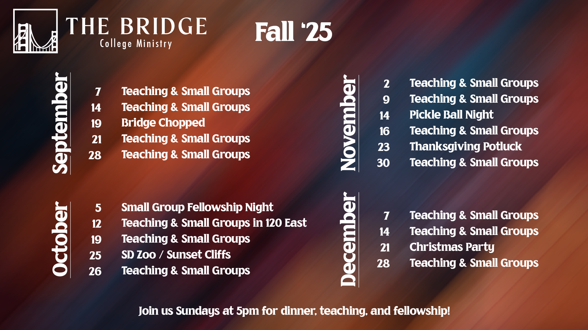 A typical Bridge night consists of dinner, worship, sermon, small groups, and opportunities for fellowship afterwards.